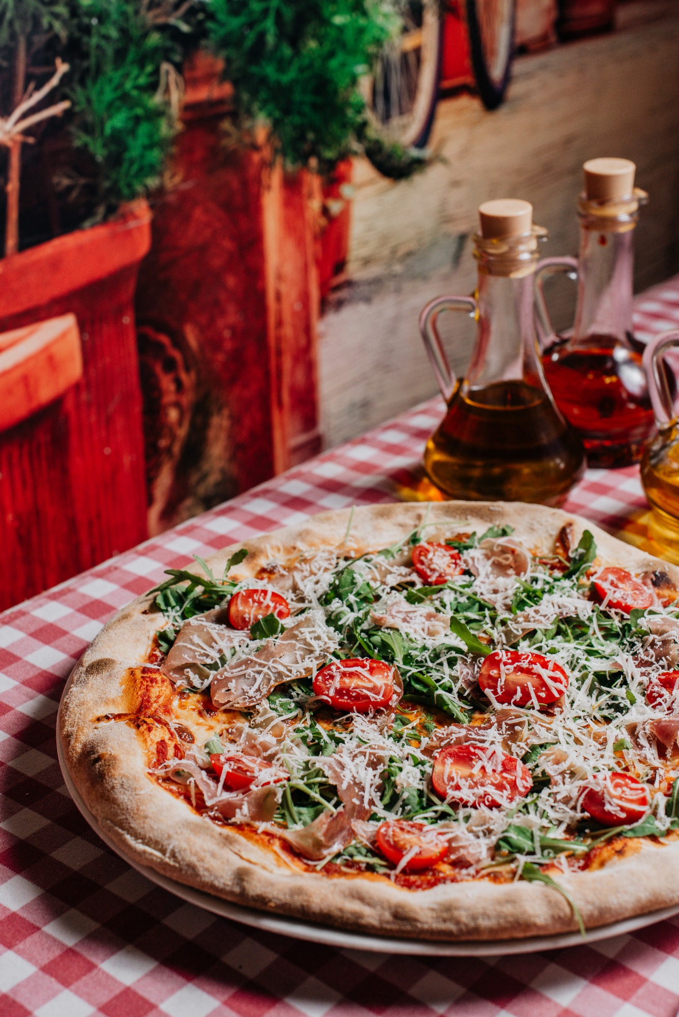 sos pomidorowy, mozzarella, szynka dojrzewająca, rukola, pomidory koktajlowe, Grana Padano -